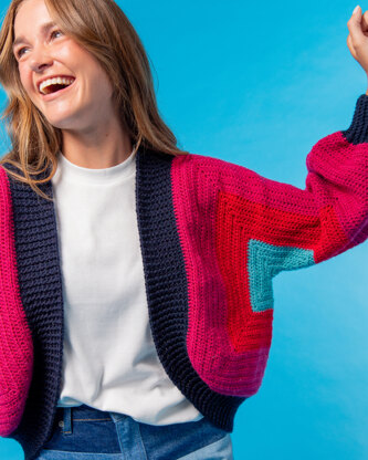 We just love a crocheted cardi to wrap around in the cooler weather, and this cosy Cloud Nine Cocoon is a clever little project made from two crochet halves, with added finishing and ribbing.