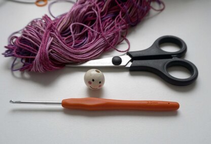gründl Cotton Quick uni or GB Wool Carina Crochet hook C (US) / 11 (UK) / 3,0mm (EU) Scissors Sewing needle Wooden balls with face 0,8-1 inch (ca.