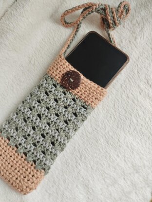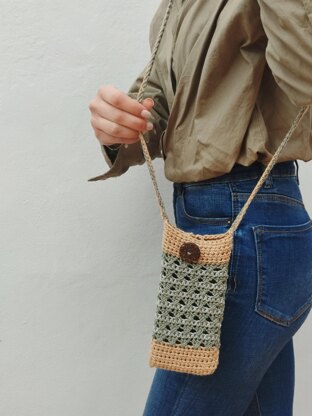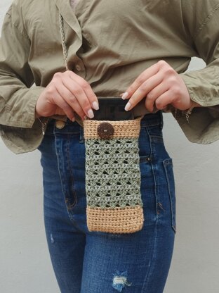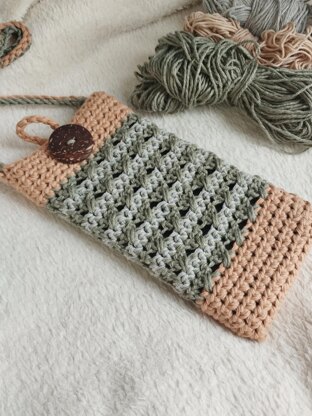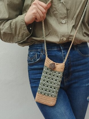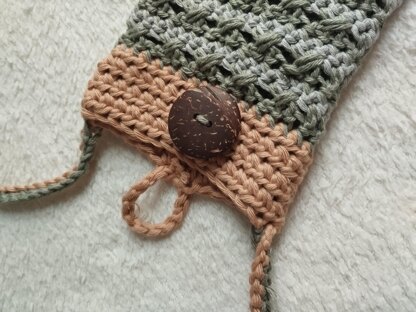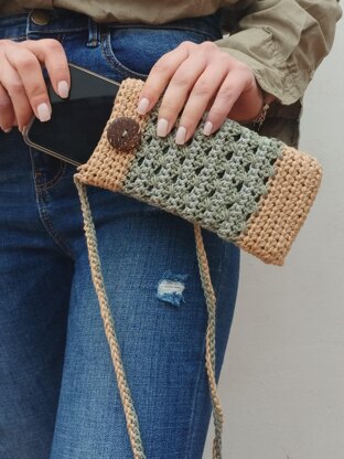 The pouch in the pattern was worked with light brown, green and grey.