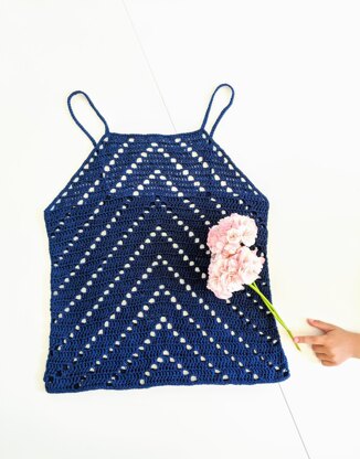 This simple yet stylish tank top is a quick and easy make using only basic crochet stitches (US crochet terms) and any cotton based sport or DK weight yarn. The top consists of a front and a back panel, worked from the bottom up and then stitched together at the sides.