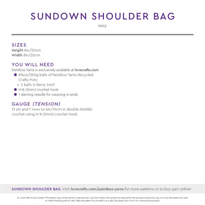 Download the PDF pattern for Sundown Shoulder Bag – Free Crochet Pattern for Women in Paintbox Yarns Recycled Crafty Pots by Paintbox Yarns & start crocheting today!