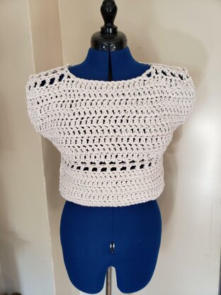 This top is worked bottom up in straight rows that are then folded in half and seamed.